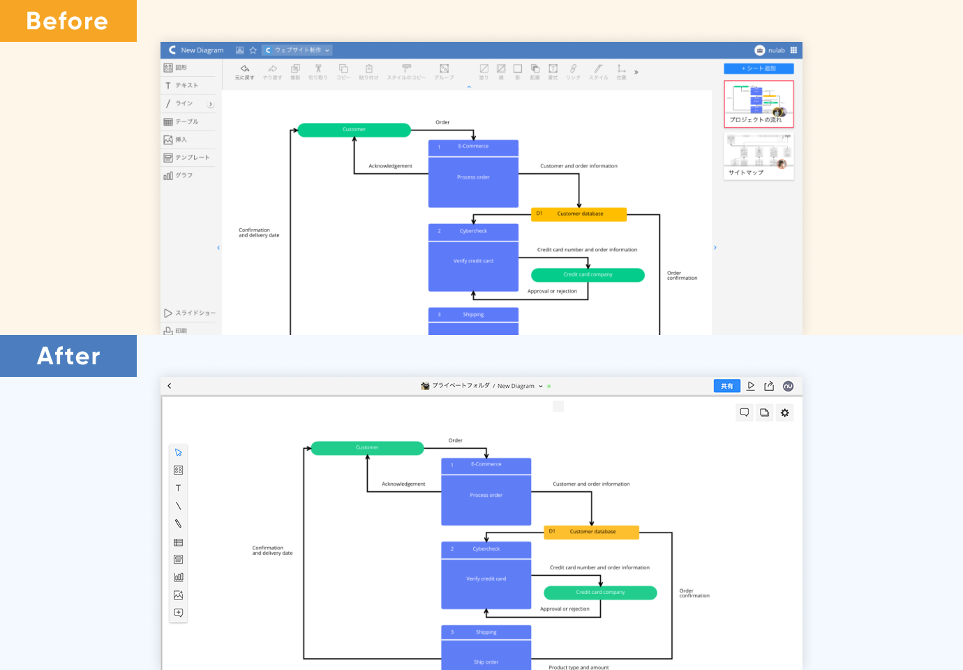これまで左にあったツールバーは、図の編集に必要な機能にしぼり、同じ場所にまとめています。また「エクスポート」や「スライドショー」機能は画面右上に配置し、「履歴機能」は右下に移動しています。
