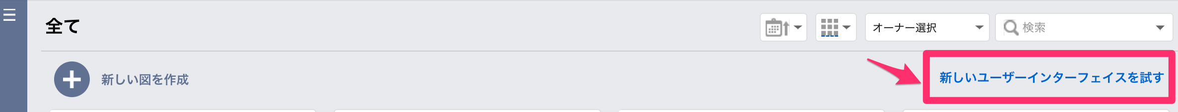 Cacooの新しいデザインは、現行デザインのダッシュボード右上にある「新しいユーザーインターフェースを試す」をクリックすることで切り替えられます。