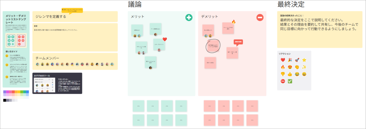 さらに、付箋のリアクション機能を使えば、「この点は特に賛成!」や「ここは少し引っかかる」といった温度感も共有できます。こうした機能があることで、メンバー全員の考えが見える形で整理されていくのがいいですね。