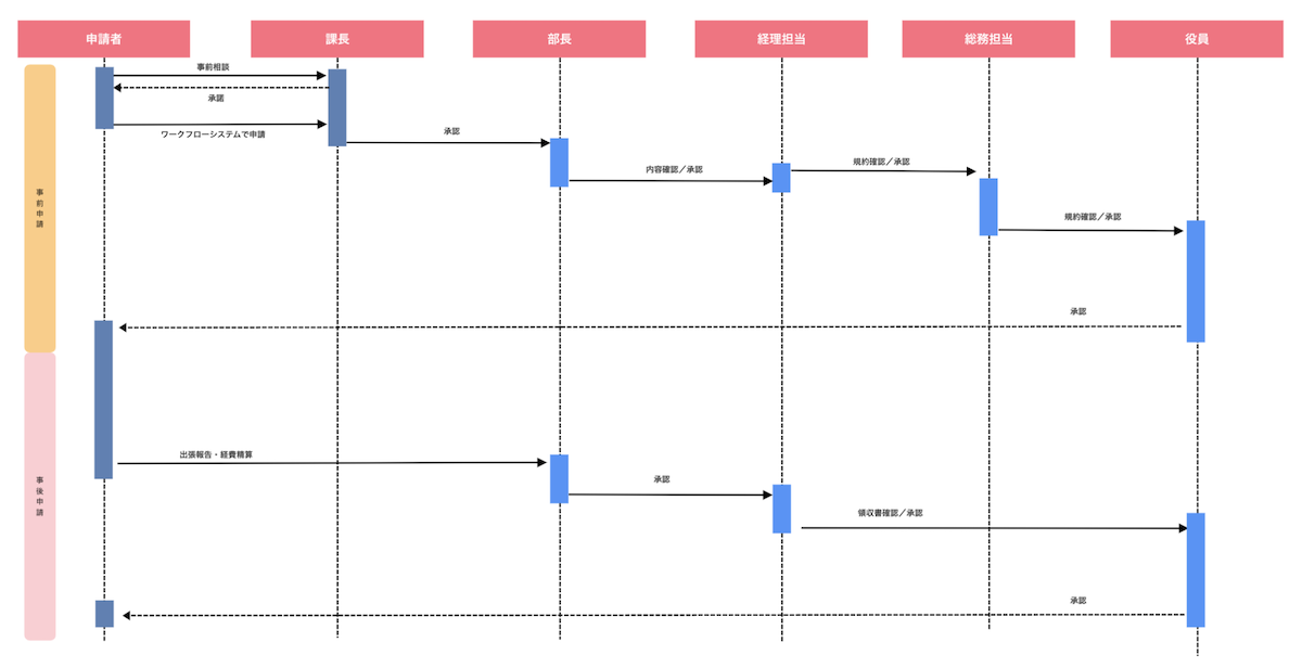 今回はシステム関連ではなく、一般的な「出張申請」を例に、「UMLシーケンス図」のテンプレートを使って作成してみようと思います。