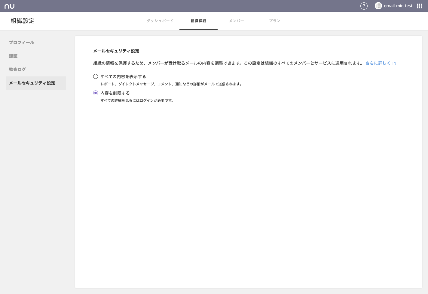 今回のリリース後に新しい組織を作成した場合は、あらかじめメールの内容を制限した状態に設定されています。各サービスのセキュリティ向上のため、「内容を制限する」がデフォルトの設定といたしました。メールの内容に詳細を記載したい場合には組織設定から設定の変更をお願いします。
