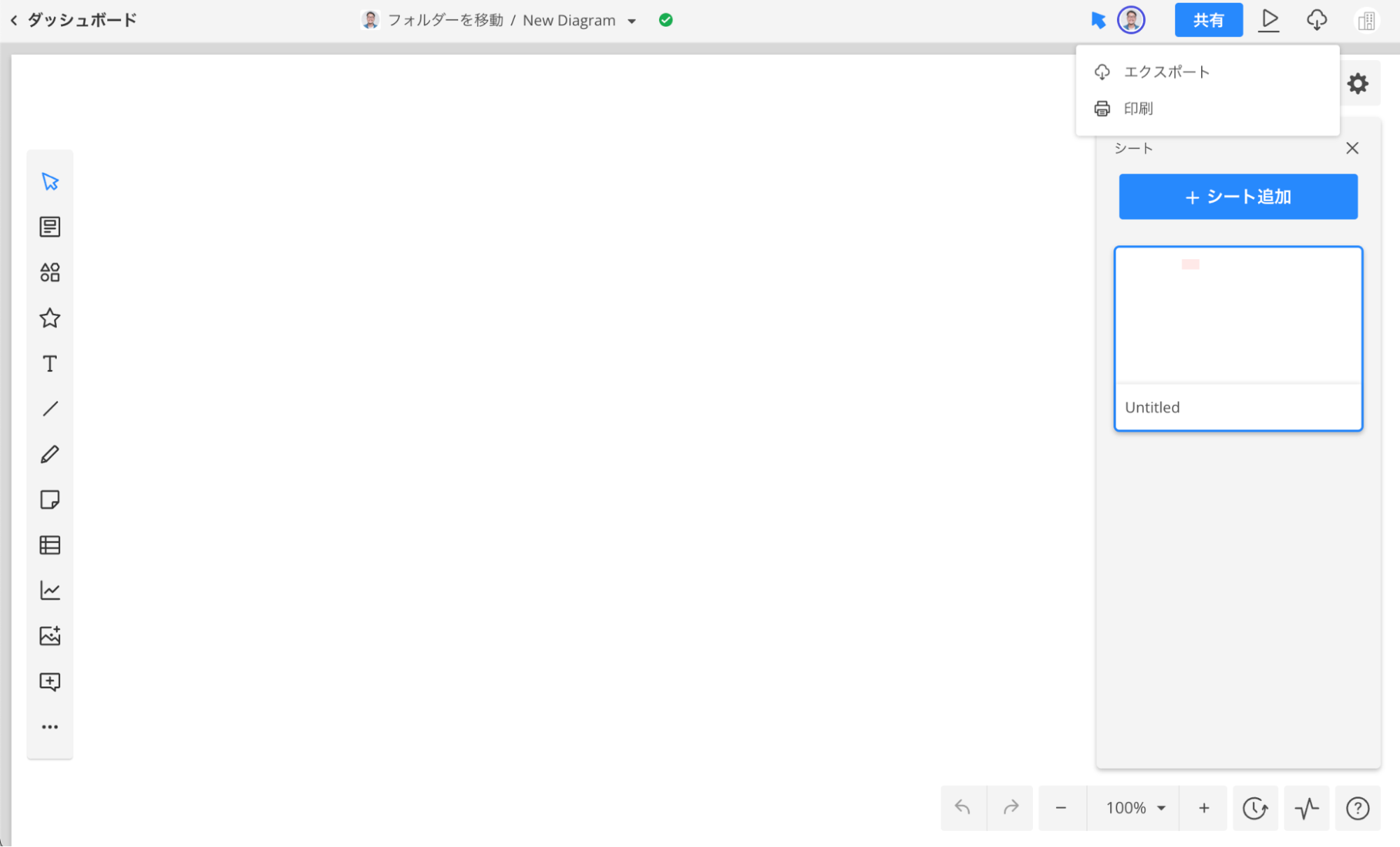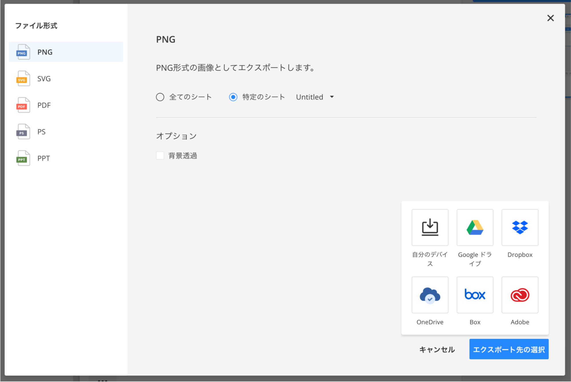 エクスポート機能をご利用の際は、グローバルバーから行ってください。グローバルバーの右上にあるエクスポート / 印刷ボタンを押すと、ファイル形式と出力先を選択できる画面が表示されます。