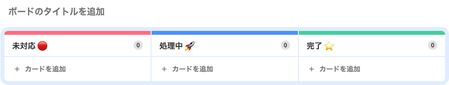 表形式のボード上で、タスクを記入したカードを管理できます。ボードには「未対応」「処理中」「完了」の3列がデフォルトで設定されています。管理するカードに合わせて、列の数やタイトル、色などを編集できます。