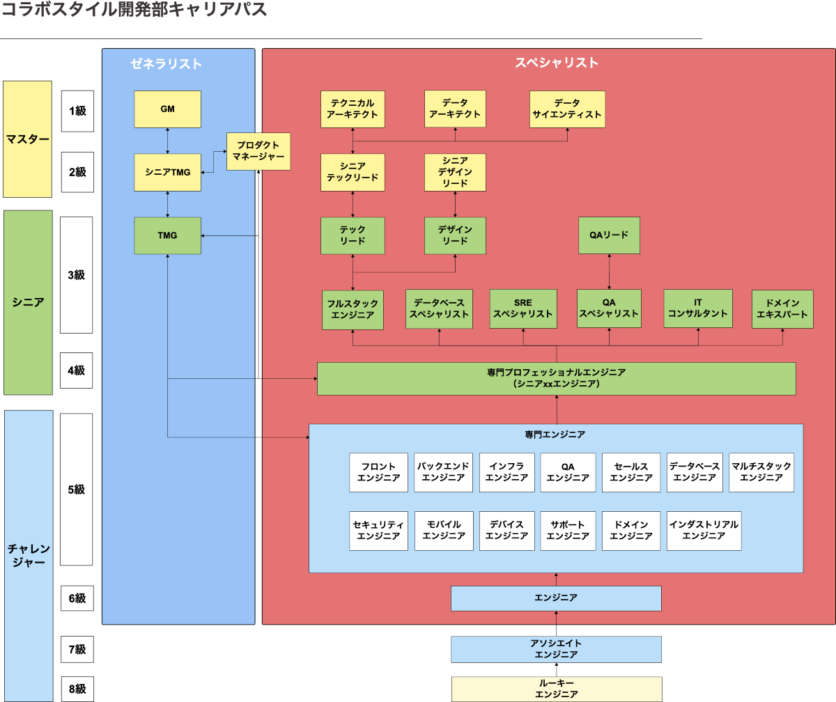 キャリアパスの設計においては、まずどのようなロールが存在するかをすべて洗い出し、各ロールに求められるスキルを細かく定義していきました。そして、ジェネラリストとスペシャリスト、それぞれのつながりも考慮して「現状のロールからどのようなキャリアパスを描くことができるか」がわかるように図を作成していきました。