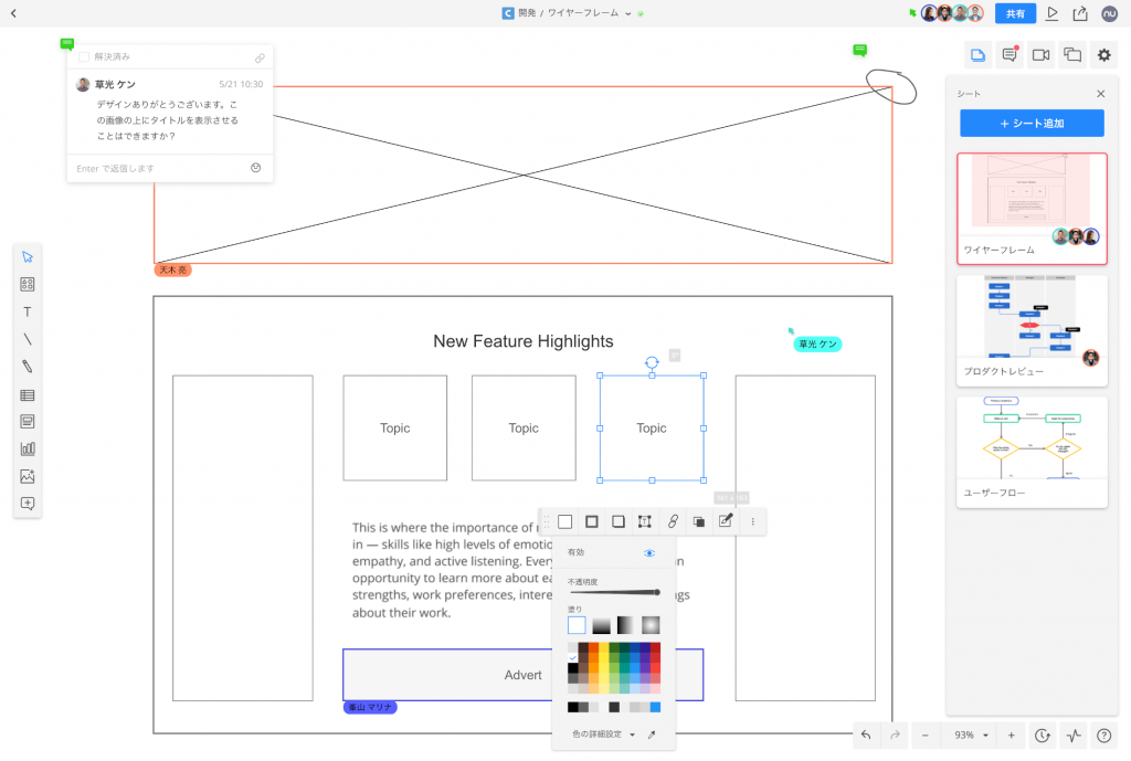 また、普段Cacooを使っていない外部の方にリンクやメールアドレスで図を共有し、編集に招待できるので、より多くの方から寄せ書きメッセージを集めたいときに便利な機能です。