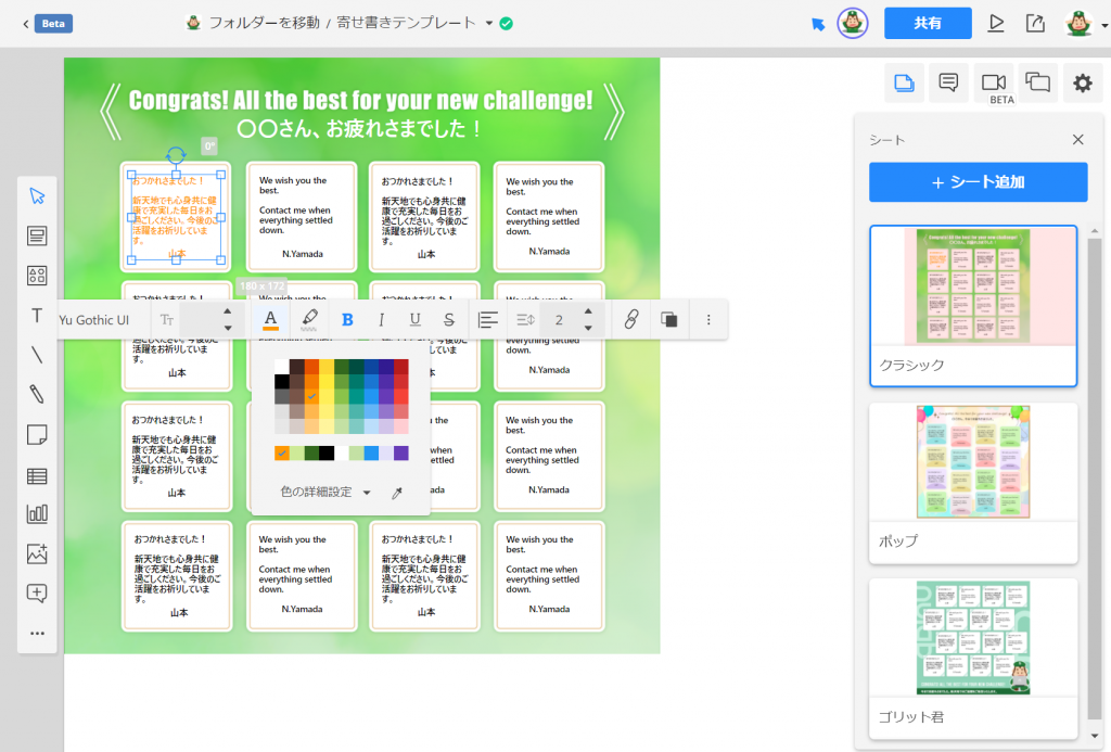 共同編集機能があるので、寄せ書きシートにチームのみんなに一度に書き込んでもらうことが可能です。編集履歴で進捗が確認できるので、短納期で完成させたいときも、フォローアップが容易にできます。