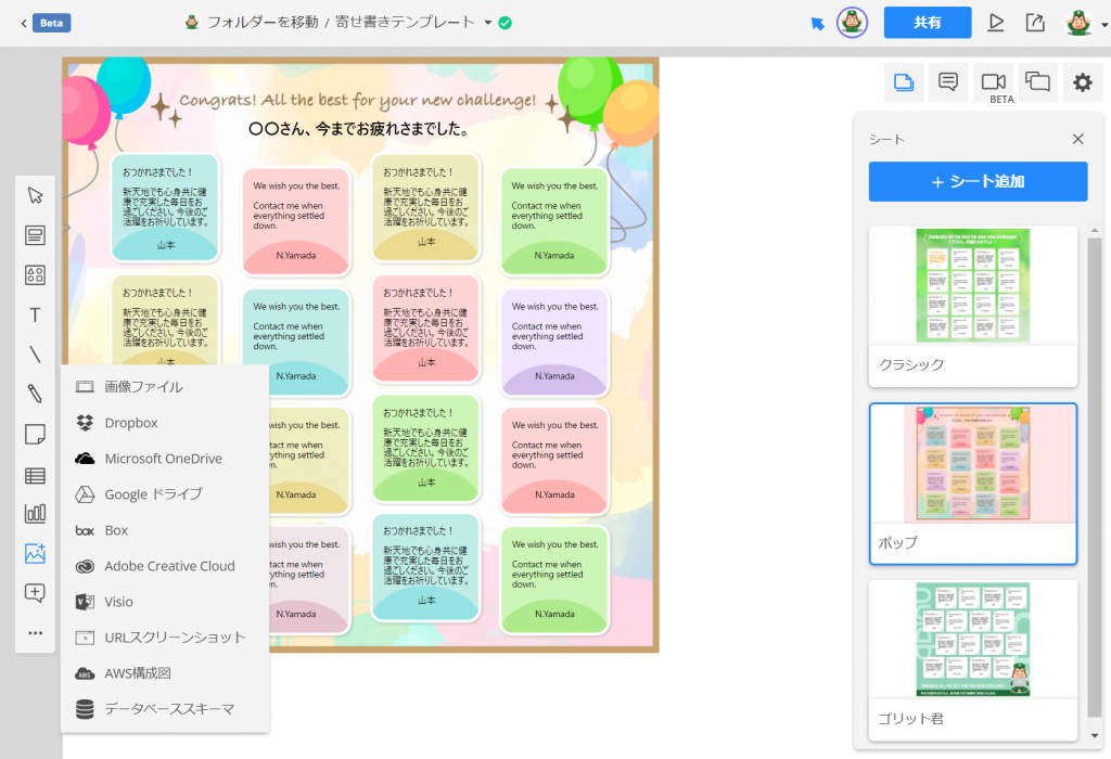 寄せ書きというと、色紙をチームメンバーに回覧して一言づつ書き込んでもらったり、カードを集めて、張り付けたりして作成することが多いと思いますが、「Cacoo」を使えばオリジナリティ溢れる寄せ書きを簡単にオンラインで作ることができます。