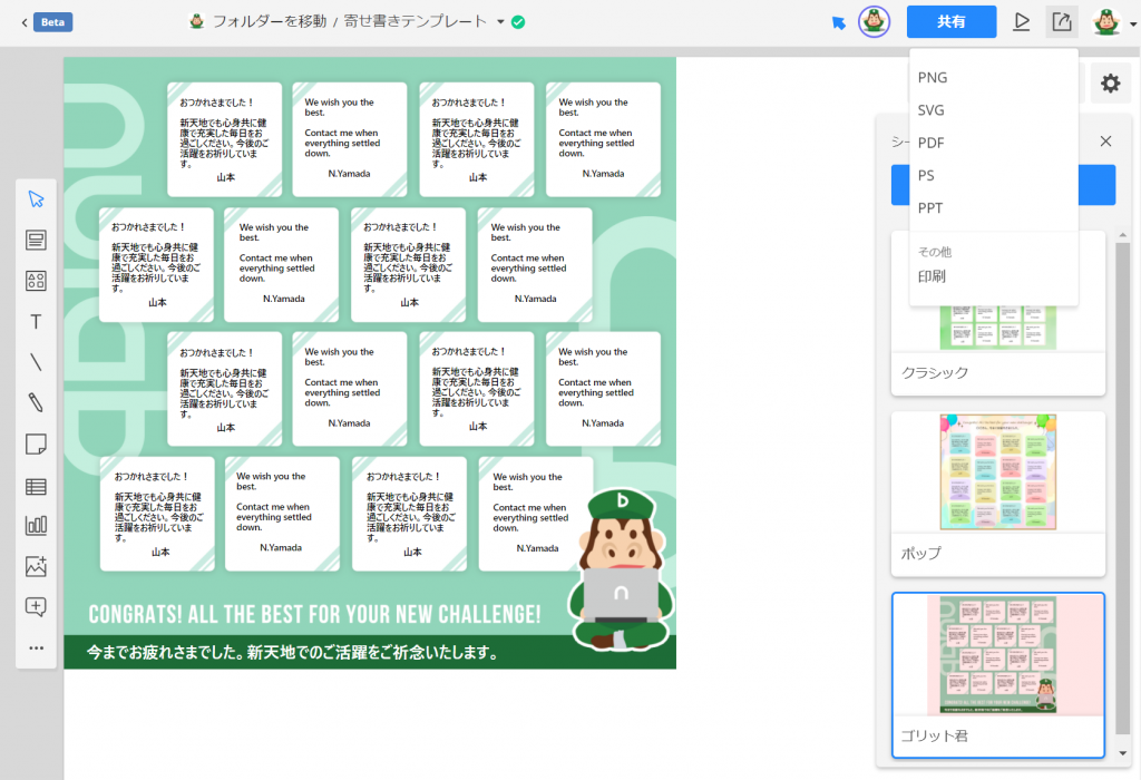 完成した寄せ書きの印刷や書き出しももちろん可能