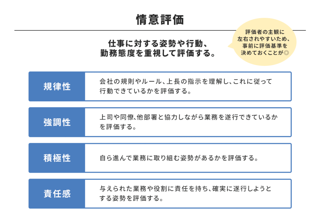 情意評価とは、仕事に対する姿勢や意欲、主体性などを対象とする評価軸のことです。たとえば、入社して間もない従業員の場合は具体的な成果や業績によって評価するのが難しい場合もあります。企業が従業員に求める行動特性を評価対象とすることが、情意評価の主な目的です。