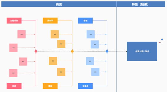 原因と結果を可視化して分析するためのテンプレートです。たとえば、プロセス上の問題点を特定したい場合や、課題解決に向けたアクションの絞り込みなどに役立ちます。評価者・被評価者の思考を可視化することによって、共通の目的意識をもって人材育成やスキル開発に取り組みやすくなるでしょう。