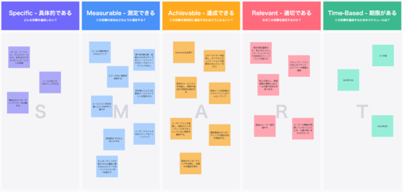 目標設定とプロセス管理に役立つテンプレートです。目標達成に向けたプロセスに明確さや目的が生まれ、スケジュールにもとづいて具体的なアクションに取り組みやすくなります。SMARTとは「Specific(具体的である)」「Measurable(測定できる)」「Achievable(達成できる)」「Relevant(適切である)」「Time-bound(期限がある)」の頭文字を取った言葉です。これらの5要素を満たしているか、評価者・被評価者の双方が確認することで、達成可能な目標設定や達成に向けたプロセスの共有、期限の設定に役立ちます。
