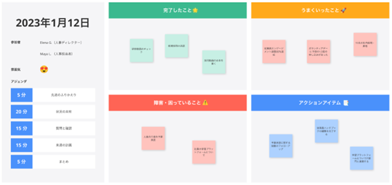1対1の面談時に、会話を整理したりメモを追加したりしながら、アクションプランを設定する際に活用できるテンプレートです。「完了したこと」「うまくいったこと」「障害・困っていること」「アクションアイテム」に分割されているため、評価者・被評価者の認識のすり合わせに適しています。オンラインで共有・参照・再利用できることから、継続的な人材育成や能力開発にもおすすめです。