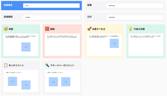 パフォーマンスに関するふりかえりや話し合い、共有に活用できるテンプレートです。実績・課題・改善すべき点・今後の目標に分かれており、被評価者による自己評価にも、評価者によるレビューにも活用できます。業績評価に際して求められる現状把握、課題や改善点の整理、次のアクションにつながる目標設定を行いたい場合におすすめです。