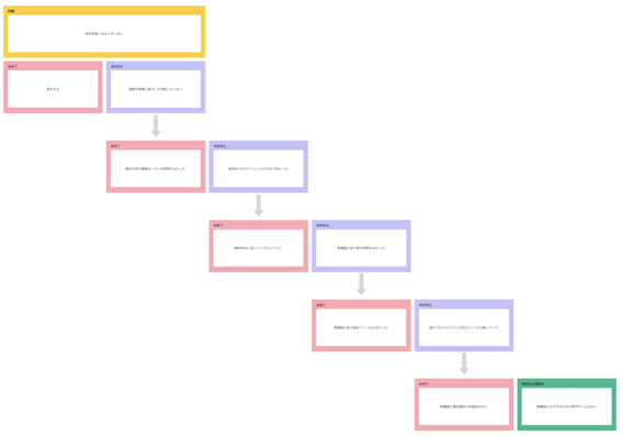 問題の根本原因を突き止めるために、5つの問いかけをするシンプルなテンプレートです。問題解決に向けてどこに力を入れるべきか、順を追って考えていく上で役立ちます。人事評価シートで挙がった課題や改善点について、評価者・被評価者の間で共通認識をもって解決策を模索したい場合におすすめです。