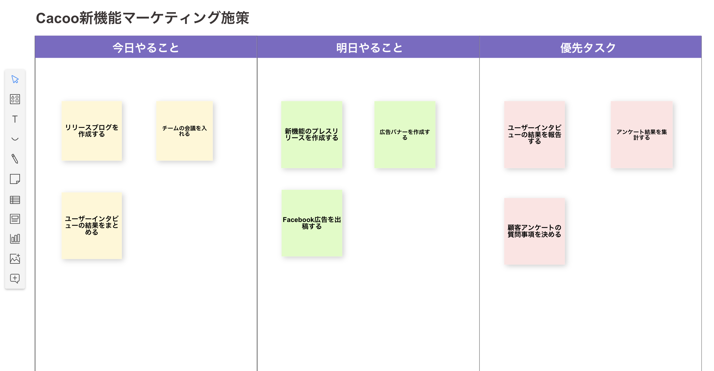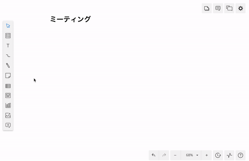 本機能を使用することで、まるでホワイトボードに付箋を貼り付ける感覚でCacooを活用できます。たとえば、ビデオ会議でアイデアを出しあったり、自分のタスクの状況を報告したり、チームでプロジェクトをふりかえったりする際に、Cacooを開いて付箋を使って意見交換をすることで、オンラインでも円滑に情報共有や議論ができます。