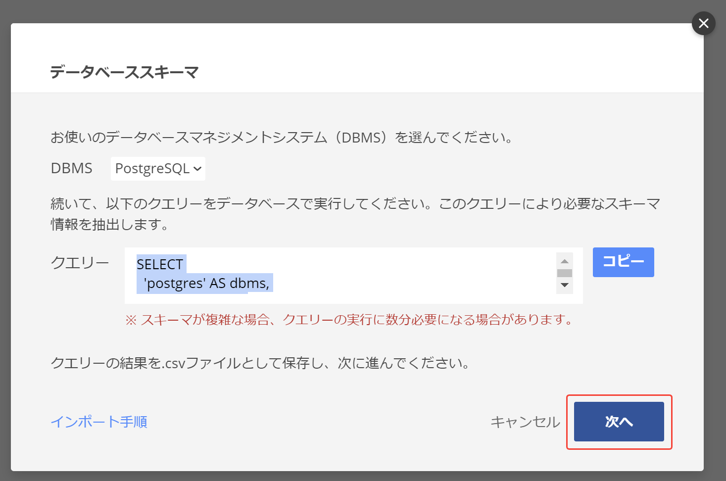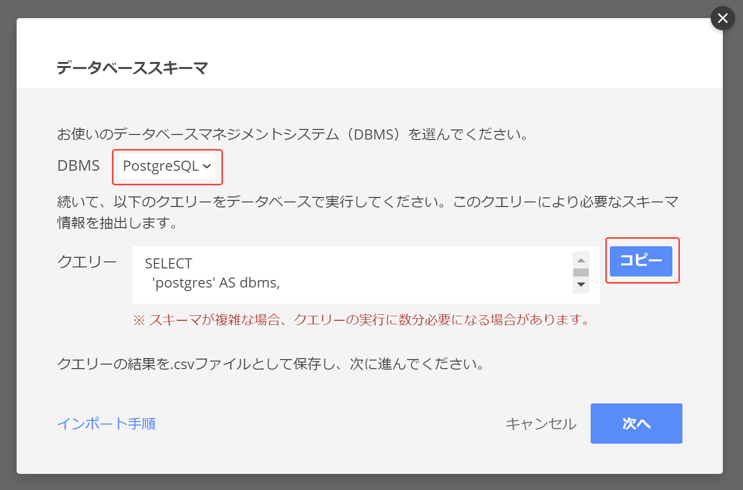 - お使いのデータベースマネージメントシステム (DBMS) の種類を選び、クエリーの [コピー]ボタンを押します。
