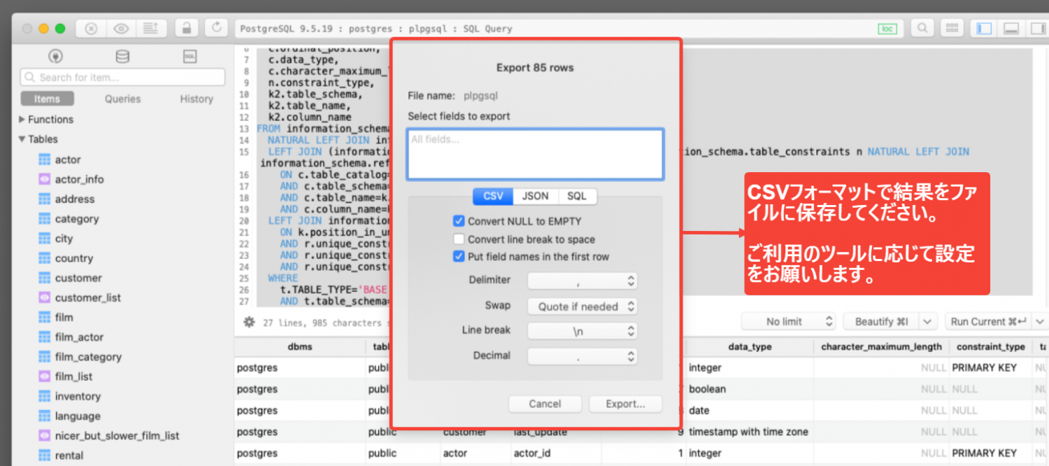 - コピーしたクエリーをお使いのデータベースに実行し、結果をCSVファイルとして保存します。