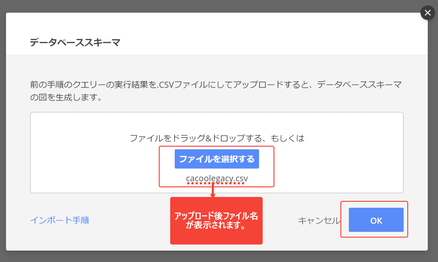 - 保存したCSVファイルをアップロードし、[OK]ボタンを押します。