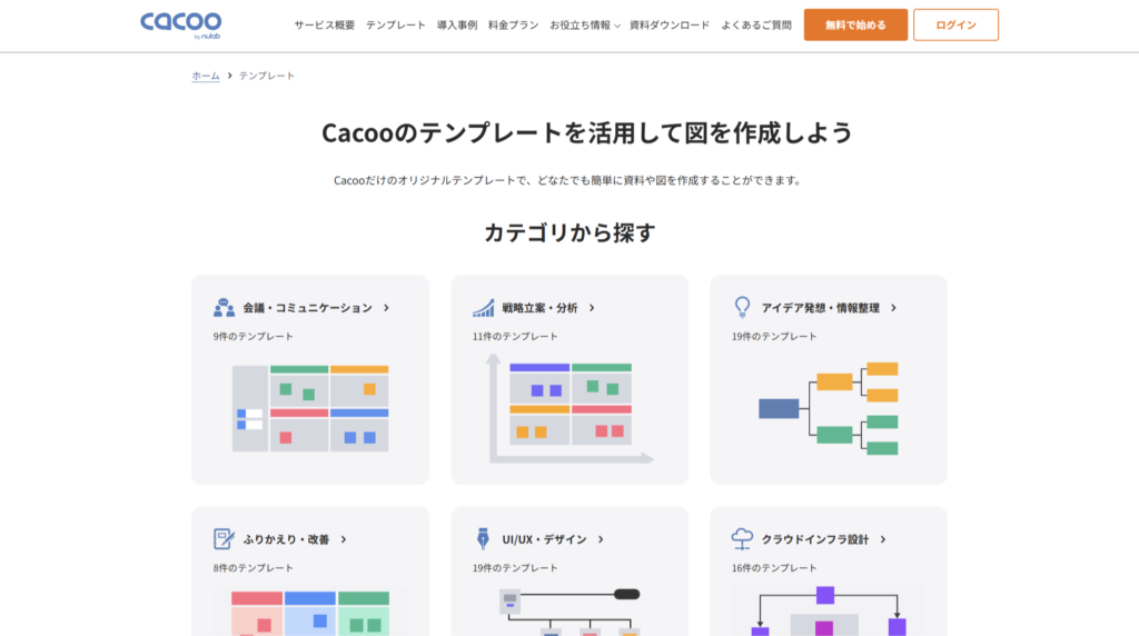 この度、Cacooサイト内テンプレート紹介ページをリニューアルし、ご提供しているすべてのテンプレートの概要をサイト内で確認できるようになりました。