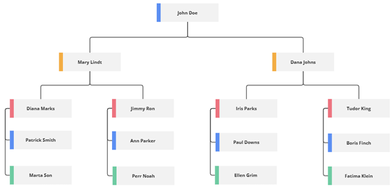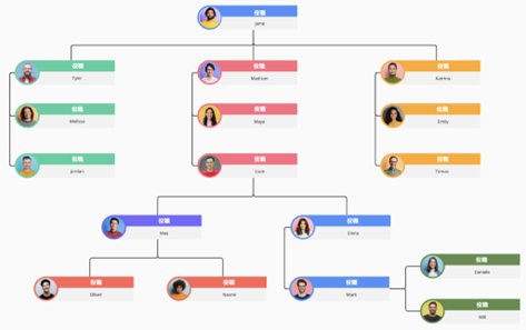 各メンバーの関係性や役割を可視化するためのテンプレートです。職務内容や人員配置の評価、責任の概要を一覧で把握したい場合に役立ちます。組織内のメンバーの名前と役職を追加するだけで組織図を作成できるため、最適な人材配置やコミュニケーションラインを検討する際に活用できるでしょう。部門とチームを分けて構造を明確化し、コミュニケーションラインをわかりやすく示したい場合におすすめです。