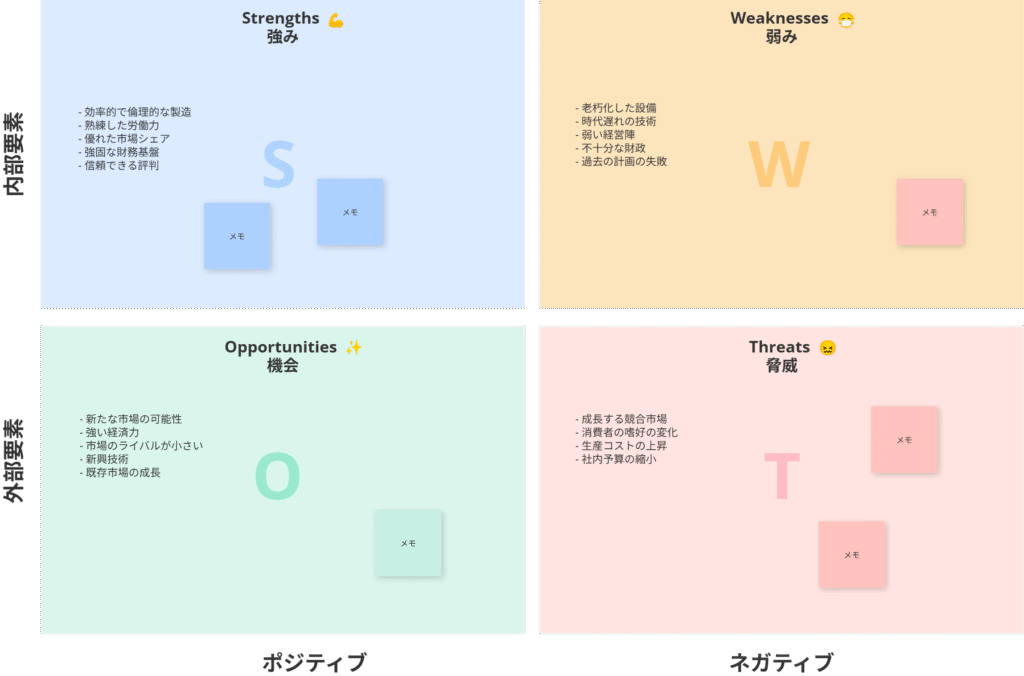 目標達成に向けてプラス/マイナスとなる要因を、内側(組織内)や外側(環境や周りの状況)に分けて評価するためのテンプレートです。