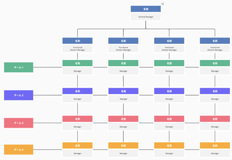 組織内でさまざまなチームやプロジェクトに所属する人々の役割を一覧化するためのテンプレートです。上下関係だけでなく、各々が異なる上司に報告しながら同じチームで働く人々の関係を可視化できます。部門間で知識や意思決定を調整したい場合や、機能別にプロジェクトベースの権限構造を定義したい場合におすすめです。