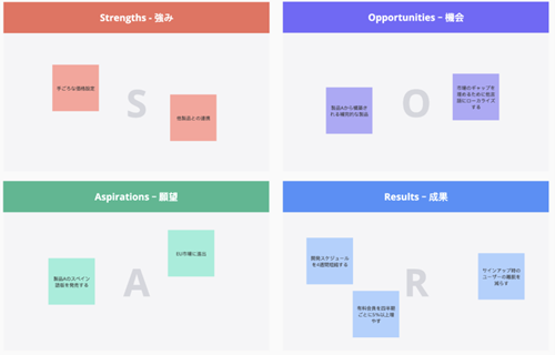 将来を見据えたポジティブな面に焦点を当てるためのテンプレートです。ビジネス、部門、製品、機能、または自身を評価し、市場の他の部分とどう比較されるかを整理して理解できます。自社の現状を分析し、測定可能な目標を設定したい場合や、それぞれの目標達成に向けた具体的な行動計画を立てたい場合におすすめです。