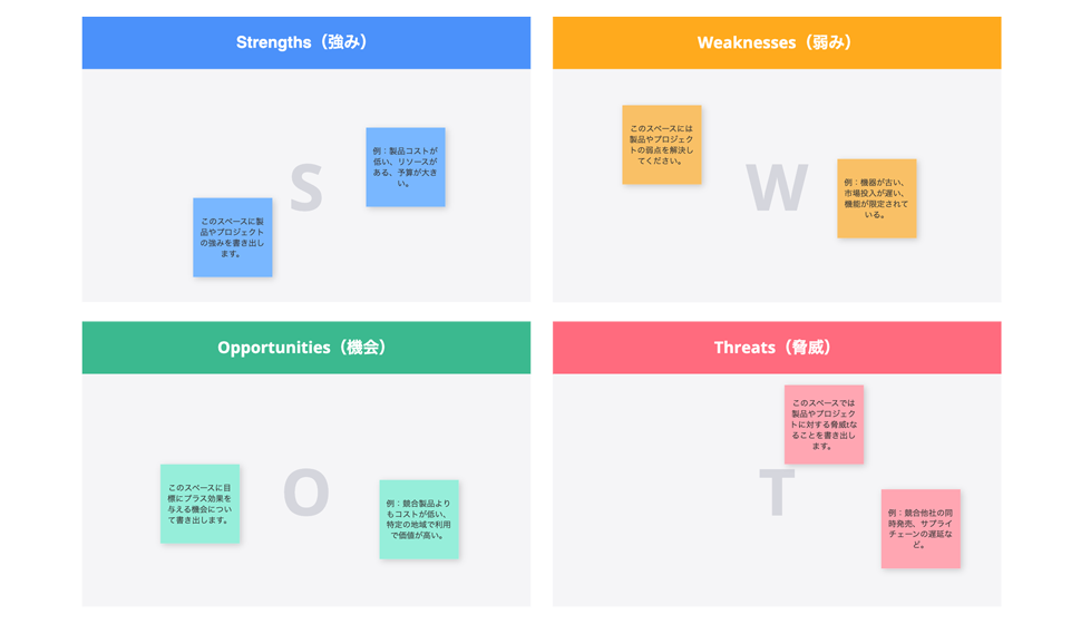 SWOT分析図:豊富な種類のSWOT図テンプレート、図形、および表記法を用意