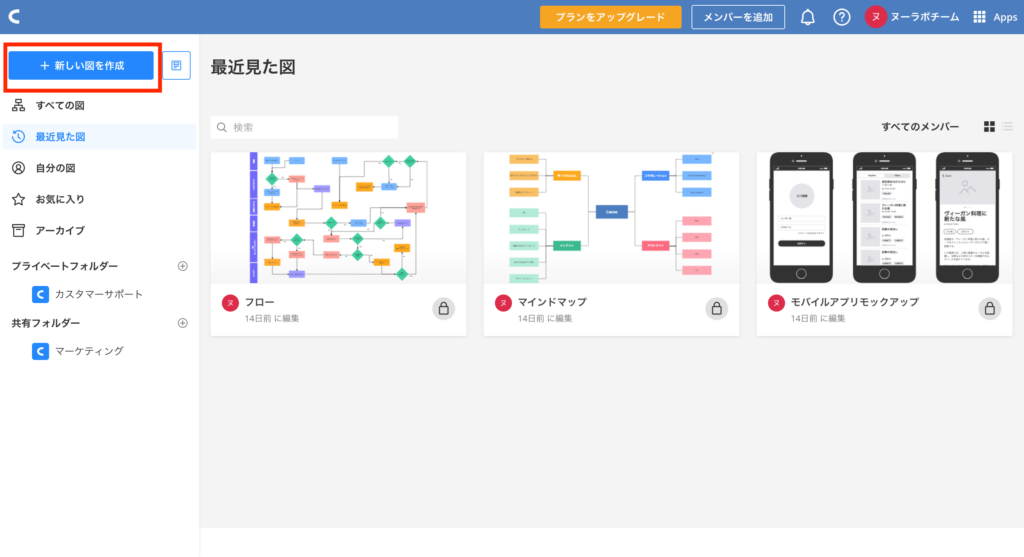 Cacooにログインすると、初めにダッシュボードが表示されます。ダッシュボードでは、作成済みの図やテンプレート、フォルダーを参照できます。ここから、新しい図を作成することができます。