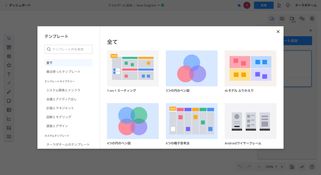 Cacooには、オンライン会議のさまざまなシーンで活用できるテンプレートが豊富に用意されています。テンプレートを利用することで、アイデア出しや作業の効率化が図れるだけでなく、専門的な知識やスキルがなくても会議を効率的に進めることが可能です。ここではオンラインホワイトボードに便利なテンプレートを紹介します。