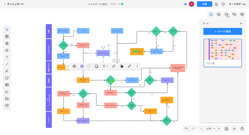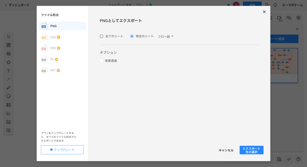 図の編集内容は自動的にリアルタイムで保存されるので、共有したいタイミングでヘッダーメニューにあるエクスポートや共有ボタンから、お好きな方法で図を共有できます。