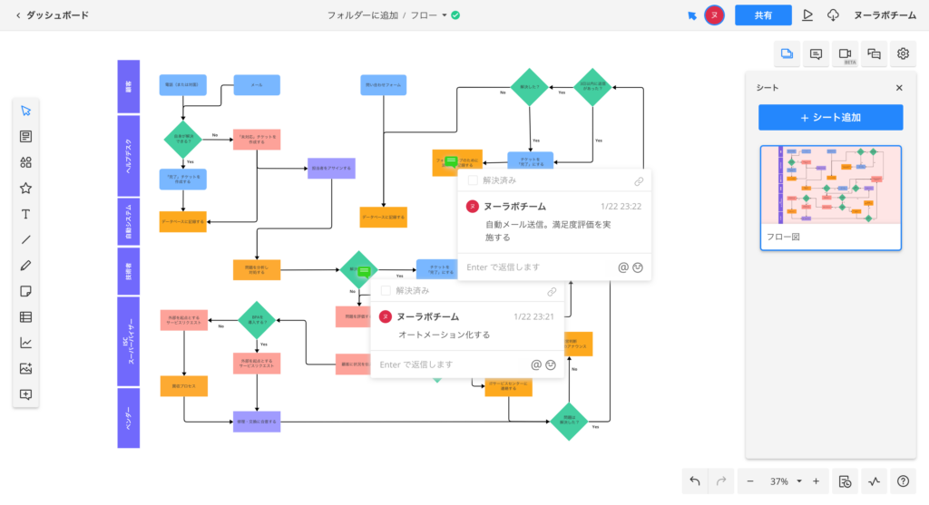 図やフォルダーを共有すると、1つの図を他のチームメンバーと同時に編集でき、図の中の好きな場所にコメントを残すことできます。履歴機能で、過去に保存した図のバージョンを確認したり、バージョンからコピーして図を作成することも可能です。