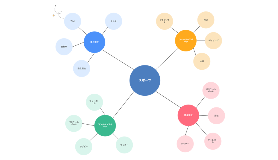 マインドマップは、中心から放射状にアイデアを展開する図で、チーム内でのアイデアの整理やブレインストーミングなどにおいて活用することができます。