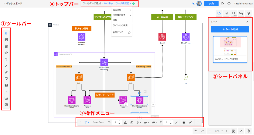 上部中央では、図の名前や種別の変更、格納先フォルダーの移動などが行えます。上部左側では、図の共有やプレゼンテーション表示の開始、エクスポートなどの図を共有するための各種操作が行えます。