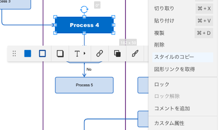 そんな時に便利な機能が「スタイルのコピー」です。図の線の種類や色、塗りつぶしの色やテキストの書式を、別の図形にも適用する機能です。同じシート内の図形であれば、ワンクリックで色や書式を整えることができます。フローチャートや組織図、作業分解図(WBS)などを作図する時に便利な機能です。