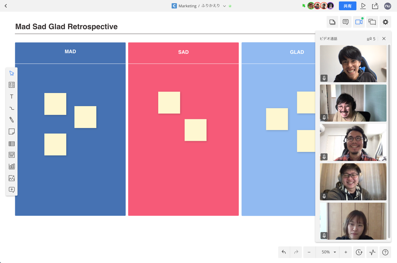 Cacooのビデオ通話機能は、テレワークなどのオンライン環境下でもチームの仕事を前進させるサポートをします。たとえば、会議の議事録として使用したり、アイデアを出しあったり、プロジェクトのスケジュール表を作成したり、プロジェクトのふりかえりをしたり、幅広い用途で利用できます。