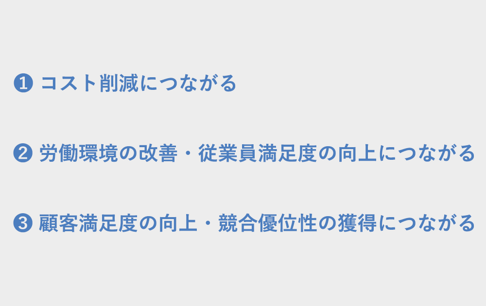 生産性向上を図ることで業務の質が向上し、顧客満足度の向上へとつなげることができます。また、企業としての競争力が増強され、競合優位性を獲得することにもつながるはずです。