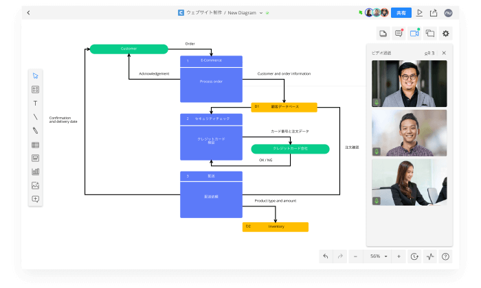 Cacooにはリアルタイムで会話が可能なチャットやビデオ通話機能が備わっています。会議室のプロジェクターを利用してアイデアを共有するほか、テレワーク環境のように離れた場所にいる相手とも双方向のやりとりを通じてアイデアを共有可能です。作成した図はプロジェクトやチームごとにフォルダ分けして共有・保存できるため、改めて議事録を作成することなく話し合いの記録を残しておくことができます。
