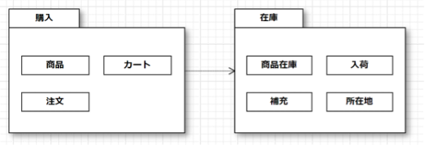 パッケージ図はクラス図の一部で、クラスをグルーピングしたパッケージ単位での依存関係を図示するのに使用します。