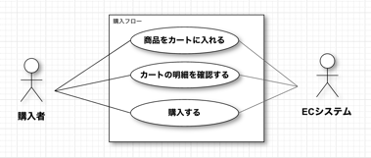 利用者やシステムを示す「アクター」と行動を示す「ユースケース」を線で結ぶだけなので技術者でなくてもとてもわかりやすい図です。「アクター」には、システムとその利用者のほか、システムから影響を受ける外部システムやハードウェアなどが含まれます。