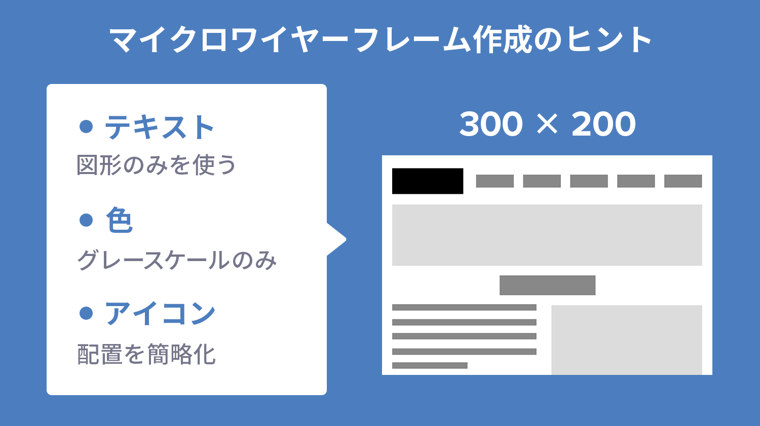 マイクロフレームは、ワイヤーフレームより忠実度の低い簡易版です。テキストも含むすべての構成要素を基本的な図形のみで表現します。究極のミニマリズム―最小限主義―ともいえるでしょう。