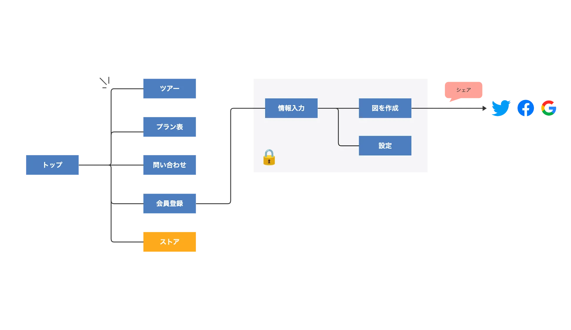 Cacooにはサイトマップのテンプレートのほか、手軽にキレイな図を描くための100種類以上のテンプレートや豊富なアイコンが揃っています。作成したサイトマップやよく使うアイコンはカスタムテンプレート・カスタム図形としてライブラリに登録することも可能です。